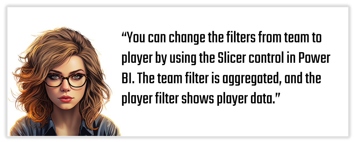 As a follow-on activity, you can take the dataset(s) and Power BI report and change or expand the visualizations in the dashboard. For example, change the team filters to player, look for outliers or anomalies, analyze the top twenty versus bottom twenty to see how these two groups differ across the statistics, explore more correlations to discover potential predictors, and so on.