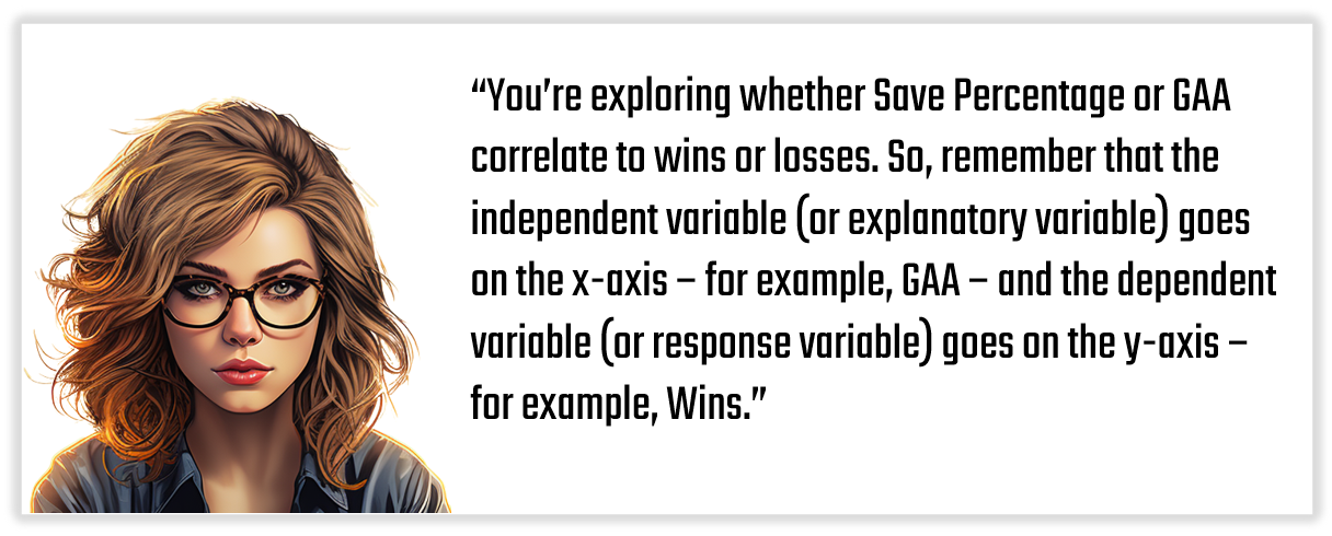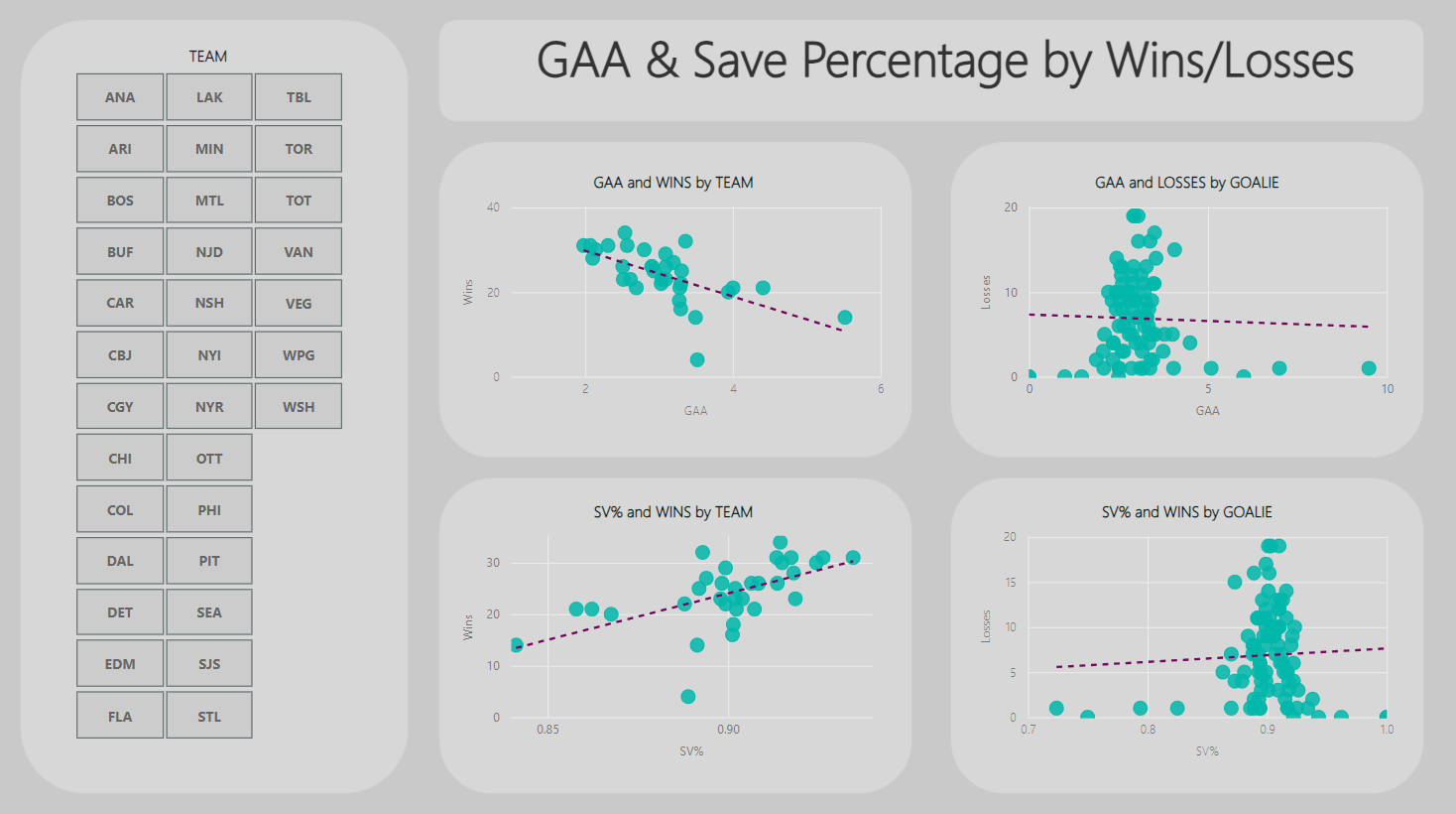 Simply put, it explores the correlation between GAA and Save Percentage and the propensity for a team to win or lose. For example, one interesting takeaway from this report is higher Save Percentages generally correlate to more Wins. You can also see clusters and outliers in the reports – and remember that interesting things happen at the margins!