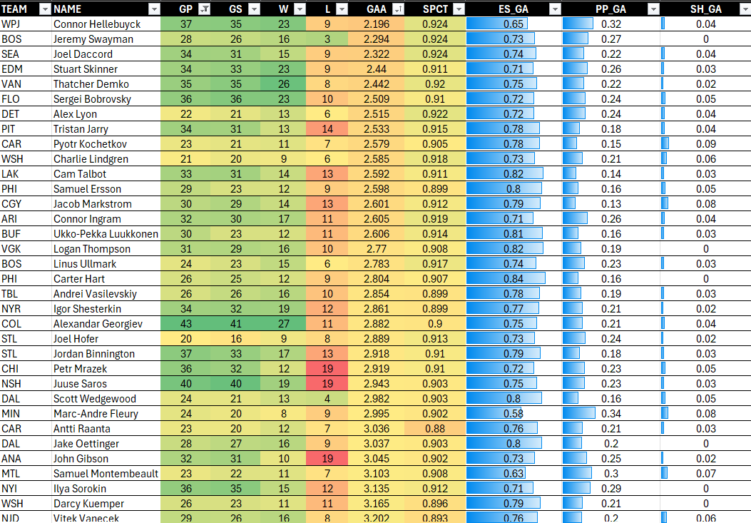 Connor's stats are impressive given the high number of games he's played. That is, his GAA is low, his SV% (SPCT) is strong, and you can see the distribution of his GA stats across even strength shifts (ES_GA), power plays (PP_GA) and shorthanded shifts (SH_GA). (His PP_GA seems a bit higher than other goalies.)