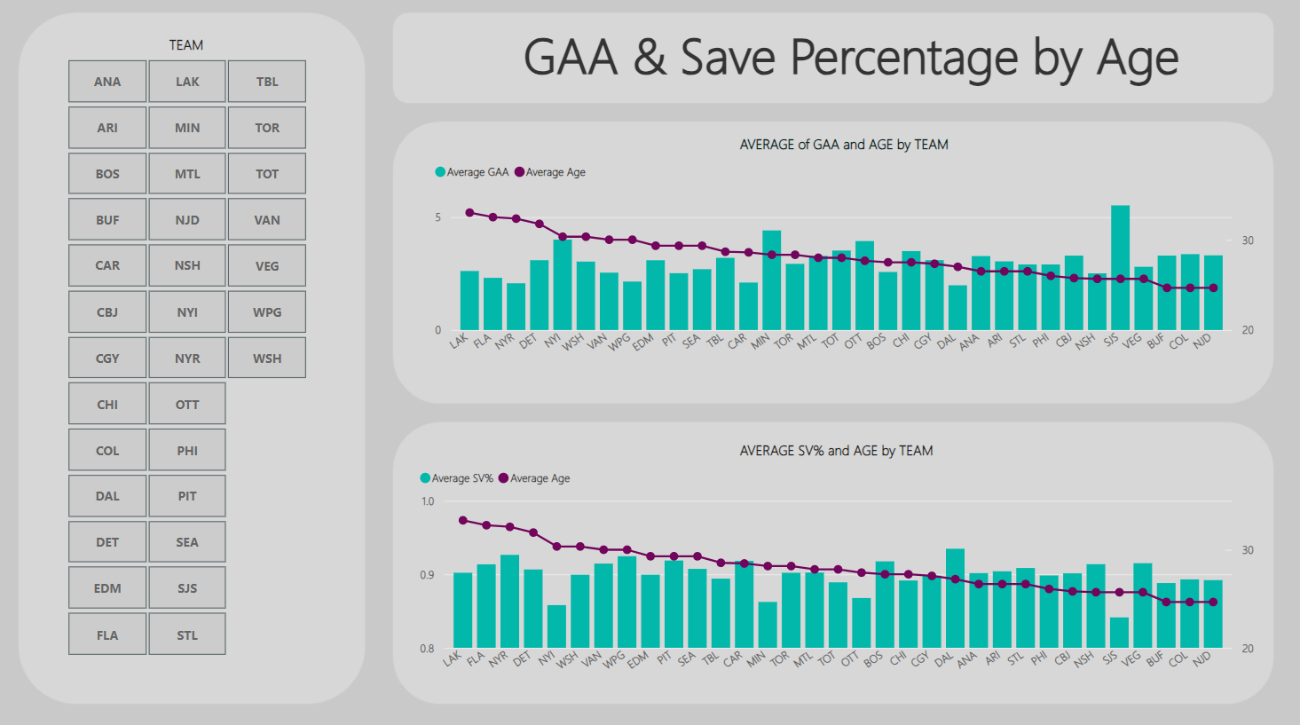 - Two Line and stacked column charts. The X-axis was Tm (Team) for both charts, and the Line y-axis was Age for both. Then, for the first chart GAA (Goals Against Average) was configured to the Column y-axis and SV% (Save Percentage) for the second Column y-axis.