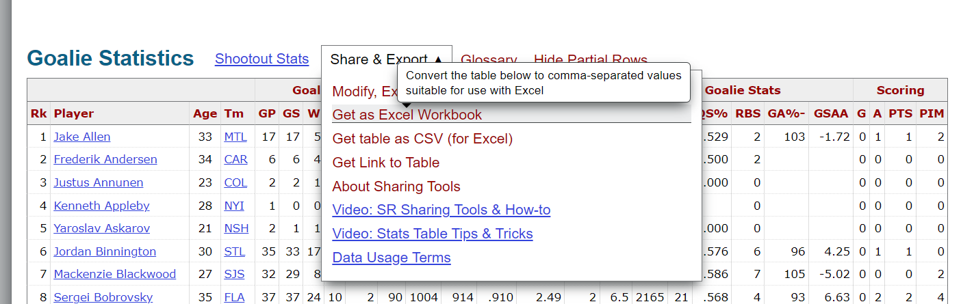 - Scroll down the page and just above the Goalie Statistics table, click Share & Export and Get as Excel Workbook.
