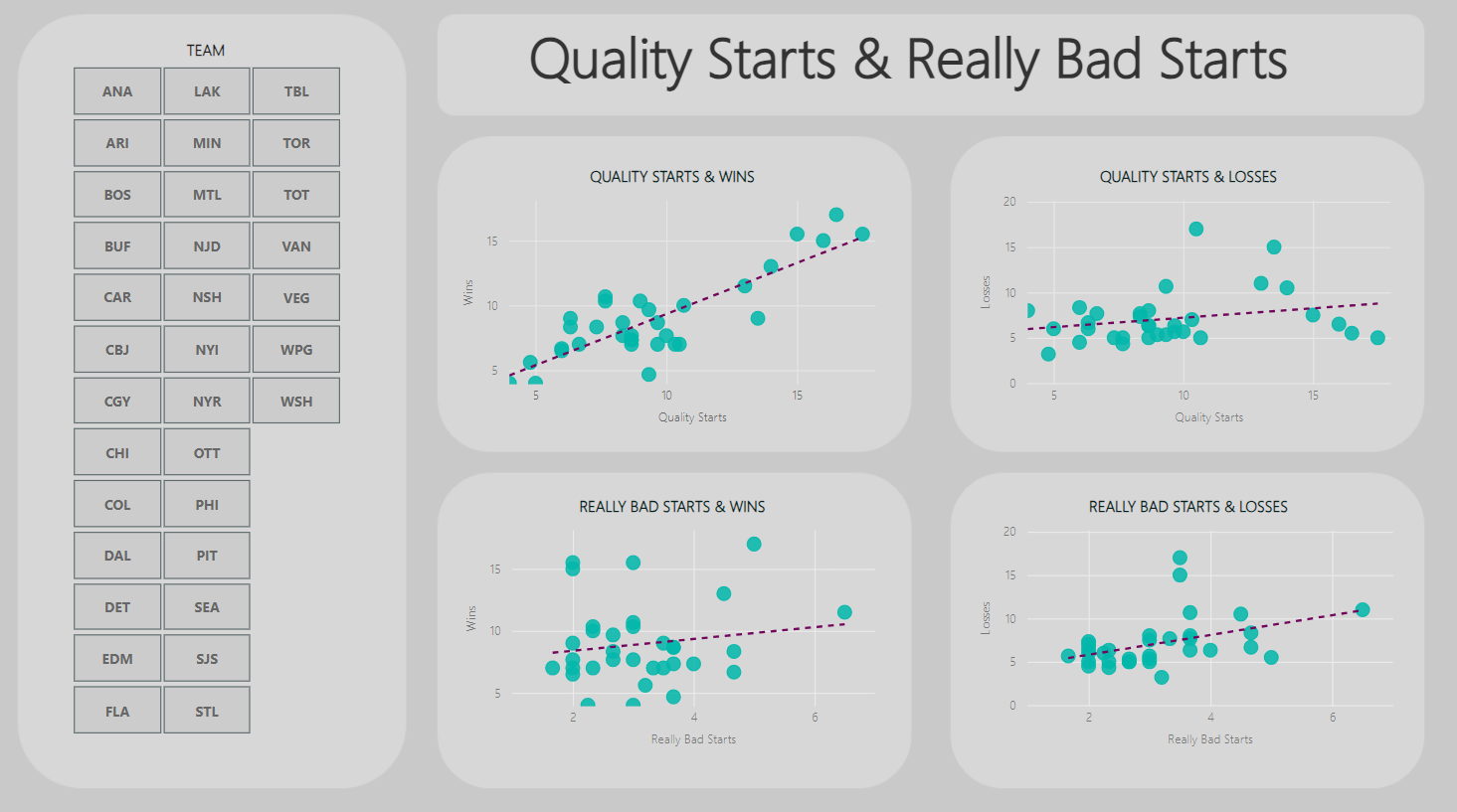 - Four Scatter charts, all with Tm (Team) configured for the Values field. For two of the charts, we added QS (Quality Starts) for the X Axis and W (Wins) for one Y Axis and L (Losses) for the other Y Axis. For the other two charts, we configured RBS (Really Bad Starts) for the X Axis and W (Wins) for one Y Axis and L (Losses) for the other Y Axis.