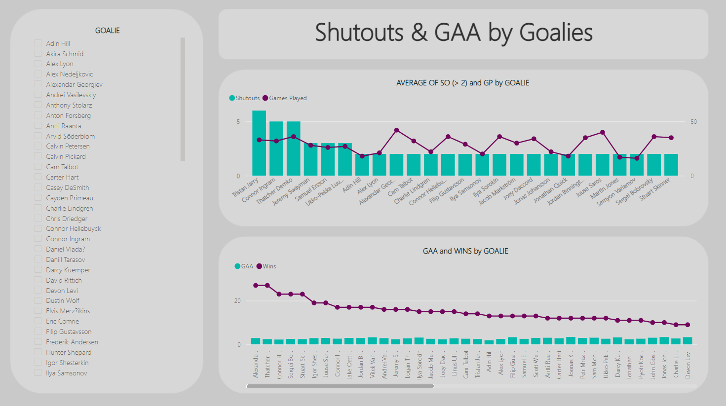 After we configured and formatted the controls, the below was the result. Here you can see a sorted view of the shutouts (filtered on greater than 2 shutouts) with Jarry, Ingram and Demko representing the top three goalies. What's interesting is their ratio of games to shutouts, compared to other goalies on the list. If you sort the second chart on Wins in ascending order, you now see Georgiev as the top goalie for Wins – though his GAA barely breaks the top twenty.