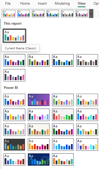 We then selected one of the themes from Power BI's native Themes functionality. To access this, click View and browse and select the theme you want to use.