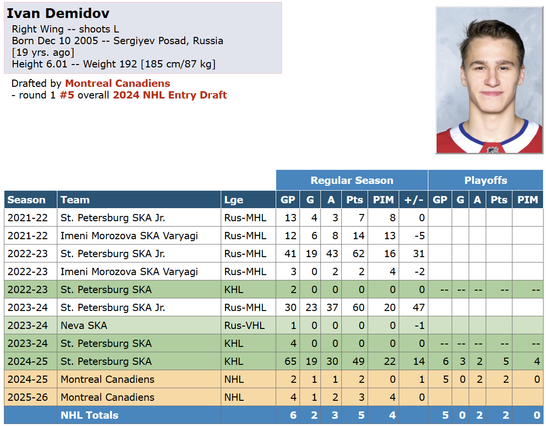 While not in the 2025 Draft, Rotowire placed Demidov in the top 50 list for newcomers to the NHL in 2025-2026. In the 2024–25 KHL season, he led SKA with 49 points (19 goals, 30 assists) in 65 games, and according to ESPN was "the highest-scoring under-20 player in KHL history for a season."