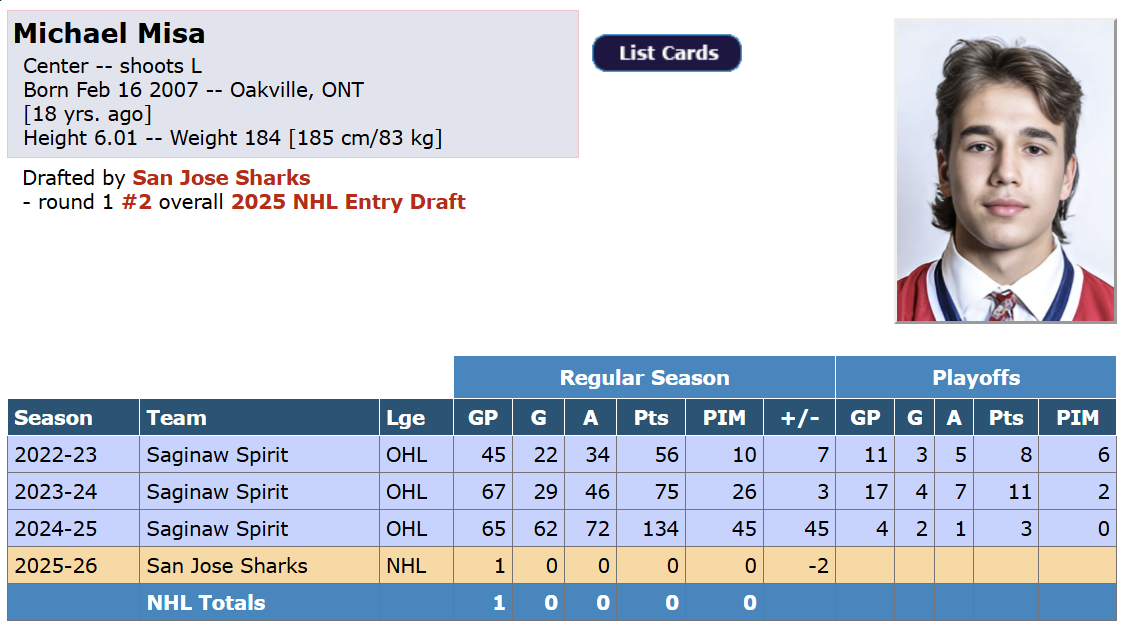 Misa was the second in the 2025 draft class (he was selected right after Schaefer, per ESPN) and Rotowire touts him as a "high-octane offensive forward." An impressive centerman, he was granted exceptional player status to enter the OHL a year early, placing him in an elite class of prospects (Wikipedia).