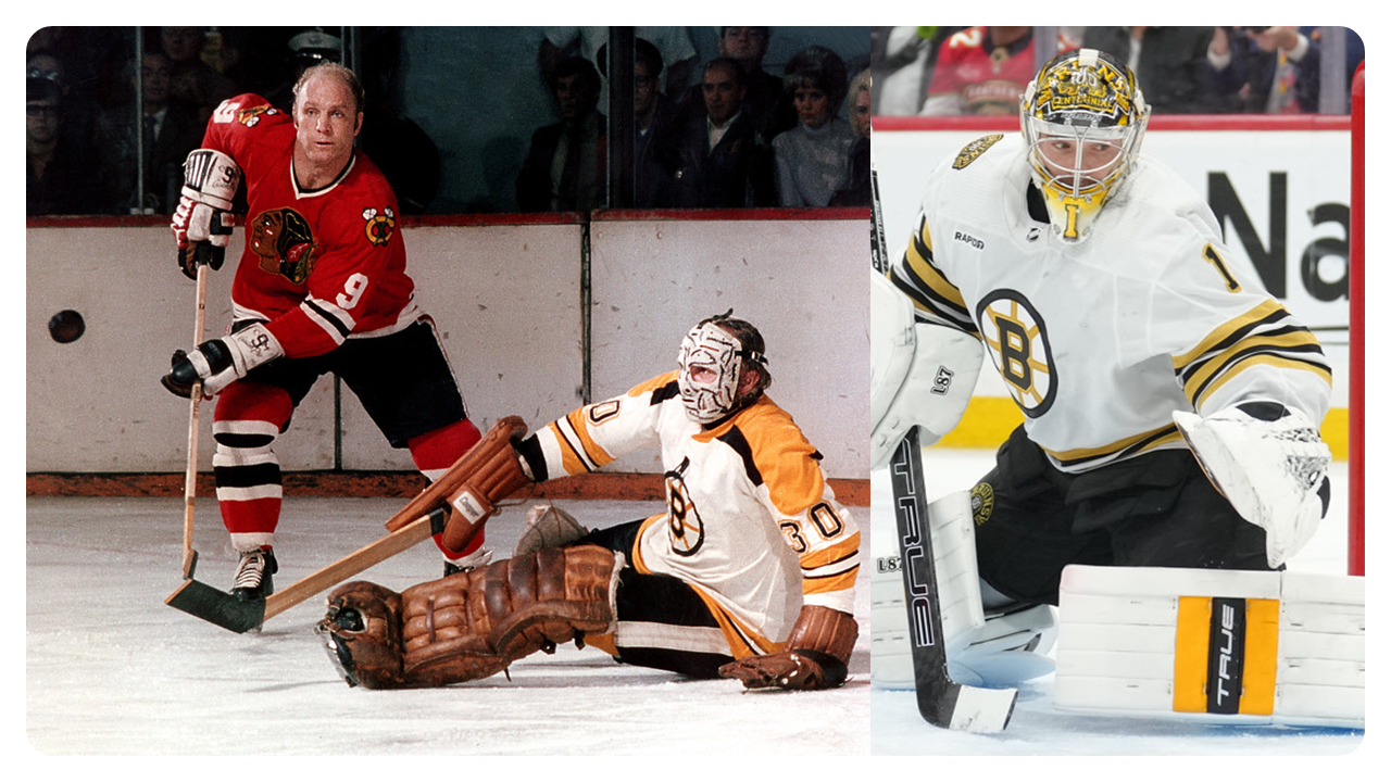 The era’s defensive schemes were often more chaotic, allowing skilled players to exploit breakdowns in coverage. Goaltending, too, was still evolving, with many goalies adopting a stand-up style. The equipment worn by both skaters and goalies was smaller and less protective, which contributed to differences in the game. You can see the comparison below between Gerry Cheevers and Jeremy Swayman.