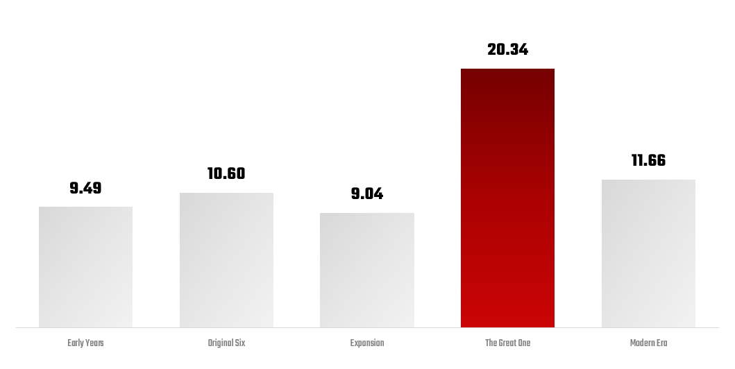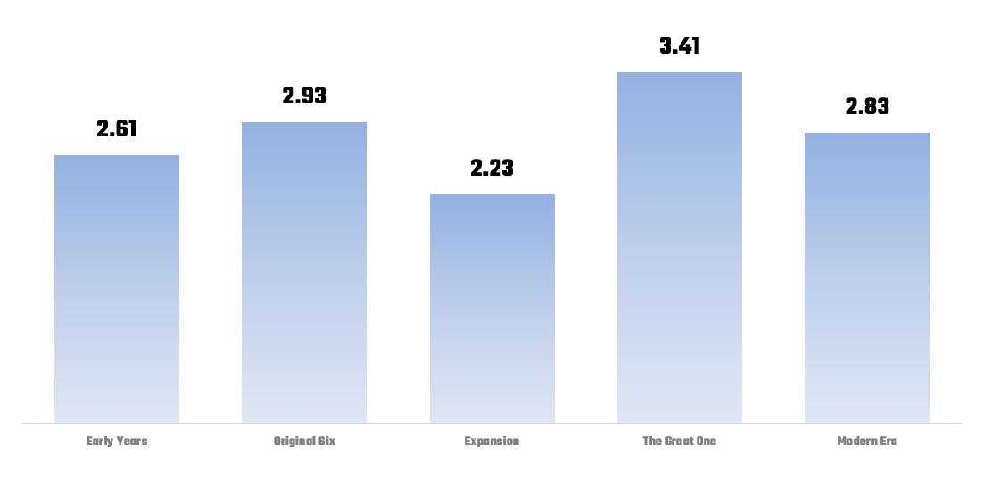 The 80s were the golden age of scoring. In our last newsletter, we highlighted the era called The Great One (which included the 80s) that showed an average 3.41 Goals per Game.