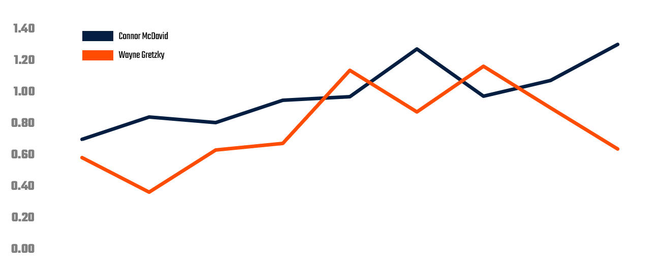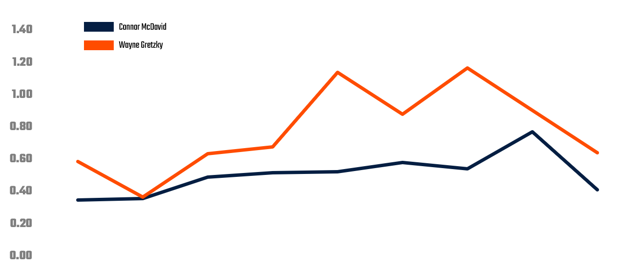 Gretzky’s highest PPG came in year seven, where he posted an impressive 2.77 PPG, a number that far surpasses McDavid’s best season (1.88 PPG in year six). McDavid’s PPG gradually rises and shows consistency, especially from years four through eight, but it never approaches the highs that Gretzky reached.