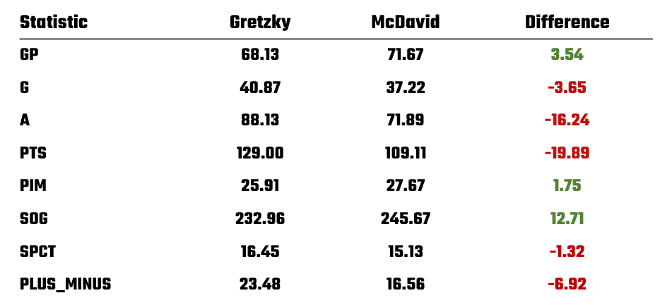 On pure averages across the sample period, Gretzky has more significant point production, shot percentage statistics and plus/minus. However, both players have very impressive statistics. And despite the different eras, both players have had extraordinary impacts, with McDavid proving himself a generational talent in a tighter, more defensively focused NHL.