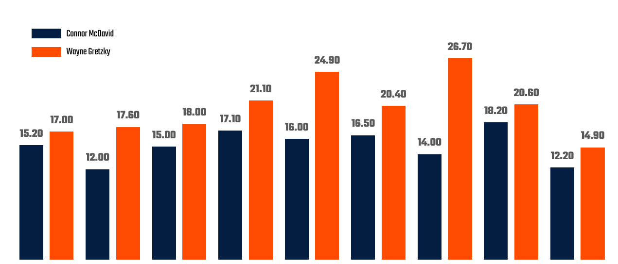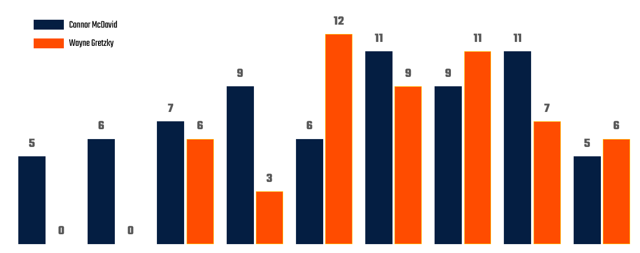 Overall, though, McDavid averages stronger across the entire nine-year period with 8 GWGs compared to Gretzky's 6.