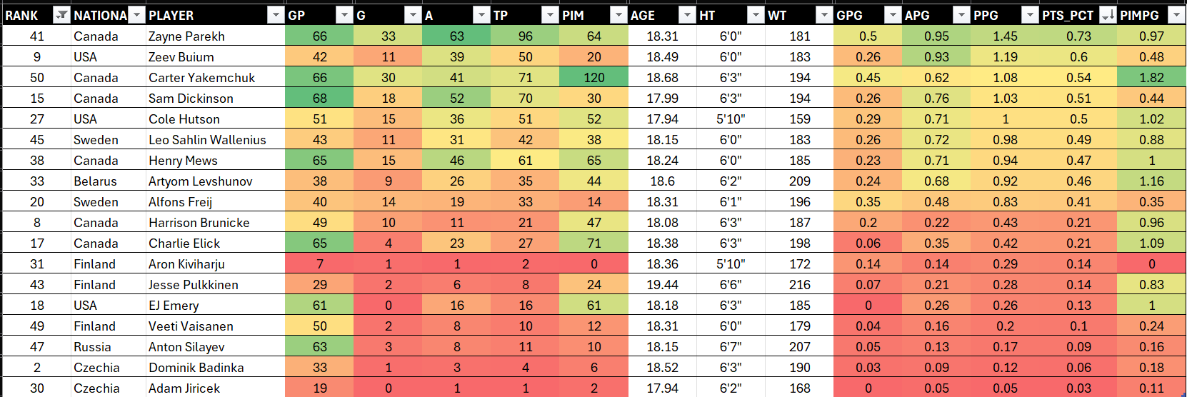 You can use the heatmap to explore the different defensemen and how they stack up against one another from a numbers perspective. For example, Zayne Parekh appears to be a decent offensive-defenseman with good point production; Zeev Buium is strong as a playmaker (judging by his assists), takes fewer penalties, but comes in under the average weight of a defenseman; and Carter Yakemchuk has a high PIM, decent point production and has some size on him. And in some ways, you can also see the ranking in this view maybe doesn't matter as much.