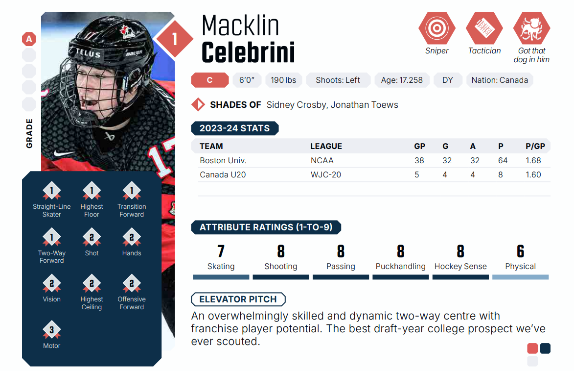 Raw numbers, however, are never enough when evaluating prospects. So, we'd recommend reviewing reviewing the Elite Prospect Draft Guide if you want a broader perspective on each player in the above list. For example, while Ivan Demidov is ranked first when sorting on Points Percentage, Macklin Celebrini is ranked first overall given the broader scouting considerations and attribute ratings noted within the Elite Prospect Draft Guide – see below.