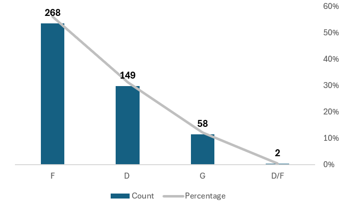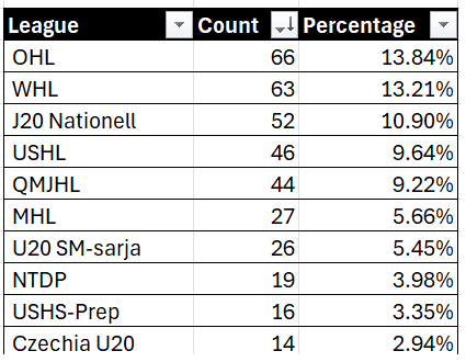 From our dataset (n = 477), we made a few general observations. For example, from our sample the top five contributing countries to this year's incoming draft cohort are Canada (37%), USA (18%), Sweden (10%), Czechia (8.4%), and Russia (8.4%). Below is a fuller view of the distribution of nationality within the sample.