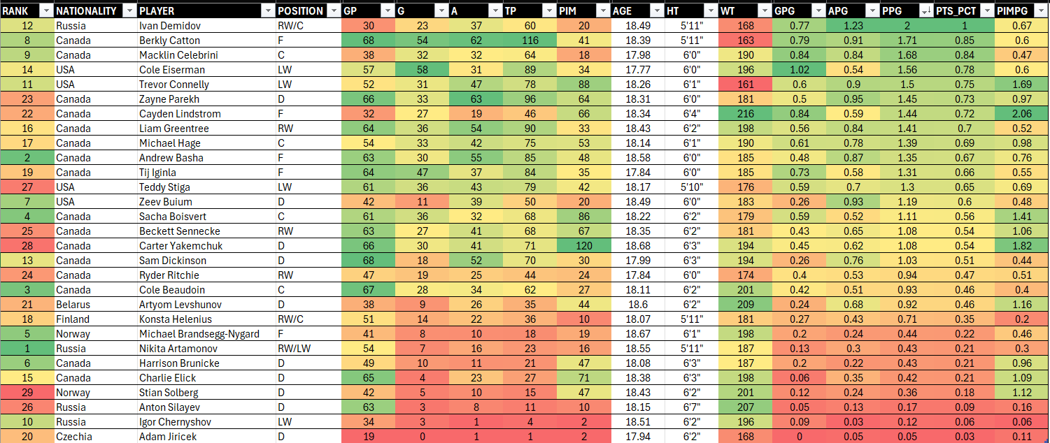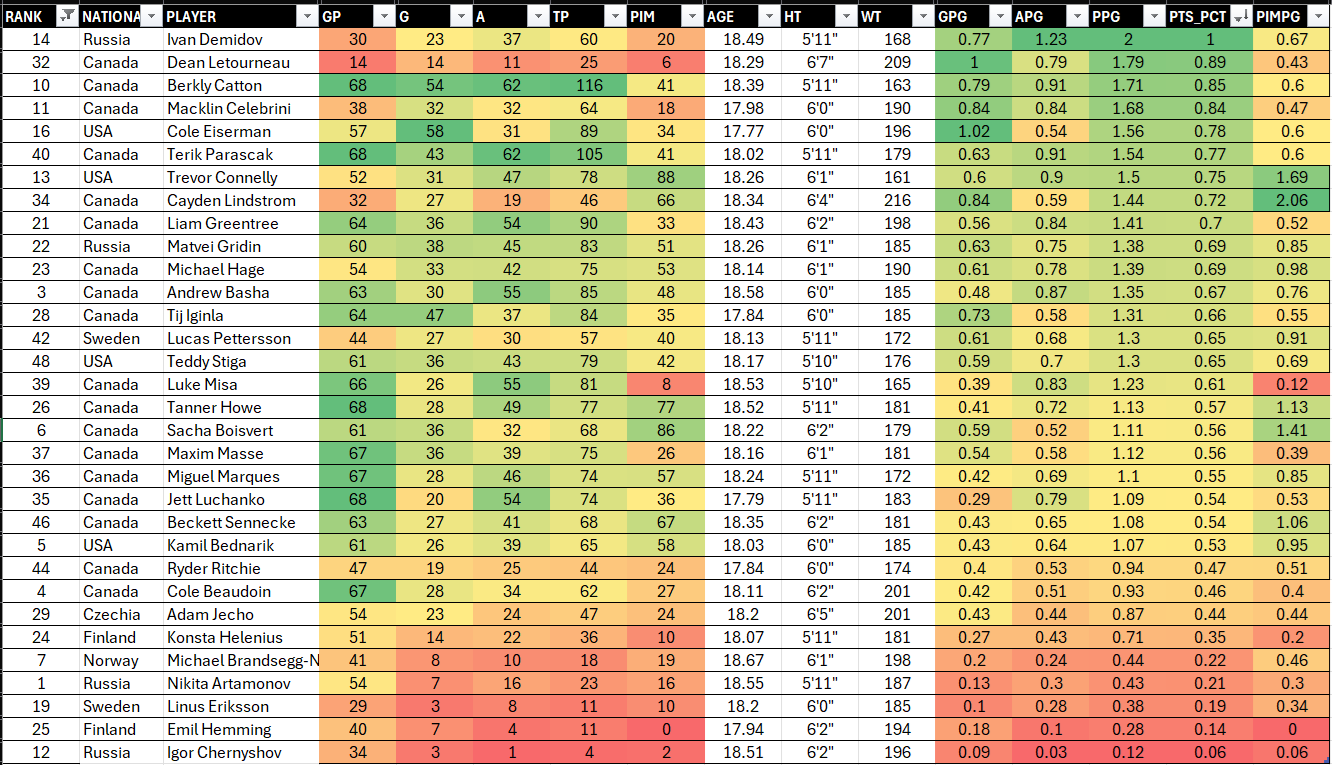 Ivan Demidov has a solid points per game statistic – both from a goal-scoring and assist perspective, has lower PIM, but is a bit smaller than others in his cohort. Berkly Catton and Macklin Celebrini have also racked up some decent point-production statistics and have lower PIM, which is good. Interestingly, Trevor Connelly and Cayden Lindstrom are both physical players with decent point production with Cayden having some serious size to him.
