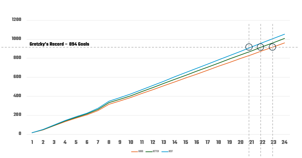 With this as our baseline, we then created a separate model using the good, better, best scenarios. This was us factoring in improvement measures, such as continued goal-scoring production/prowess, improved team around him, etc. We measured the good at 5% improvement (possible), the better at 10% improvement (less likely) and the best at 15% (not likely). The best gets McDavid across the record in his 20th season, so on par with Ovechkin. The better is 22, and the good is 23.