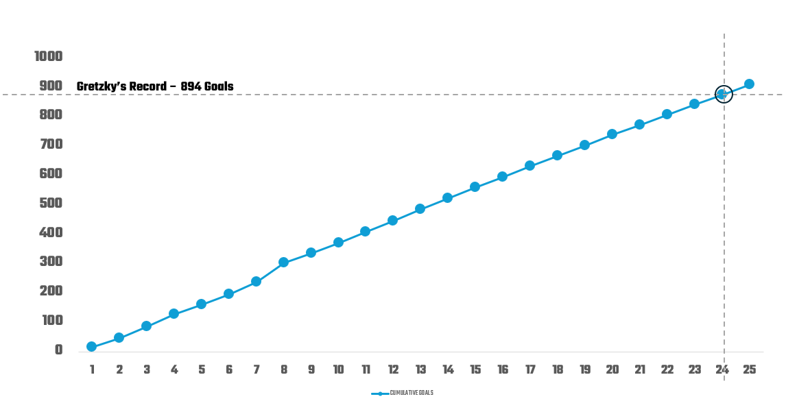 In this week's newsletter, we highlighted the accomplishments of The Great One and explored who might beat his Regular Seasons Goal record of 894 goals. Breaking Gretzky’s records is more than a statistical feat; it’s about consistency, longevity, and exceptional talent. We found that Alex Ovechkin is on the brink of surpassing Gretzky’s career goal record and younger players like Connor McDavid show promise with potential career longevity and scoring ability.