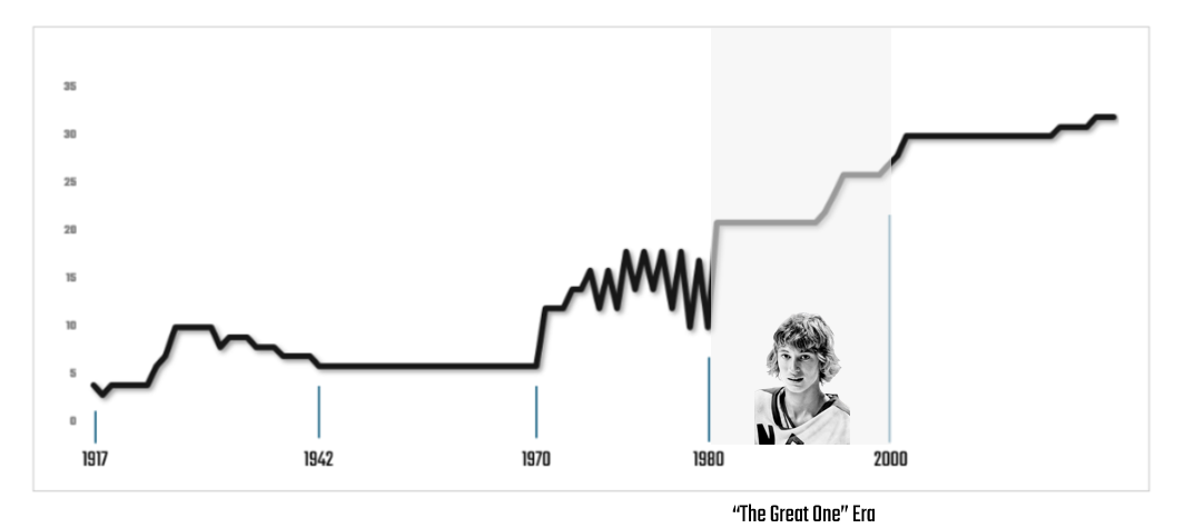 In a recent newsletter entitled From Chalkboards to AI: 108 Years of NHL Hockey (from our Vintage Hockey series), we broke out the NHL history into five eras, one of which was called "The Great One" era – because this was the era of Wayne Gretzky. You can see on the chart below (showing the number of expansion teams across the NHL's 108 year history) that this was a significant period of growth for the NHL, which has given way to today's modern game.