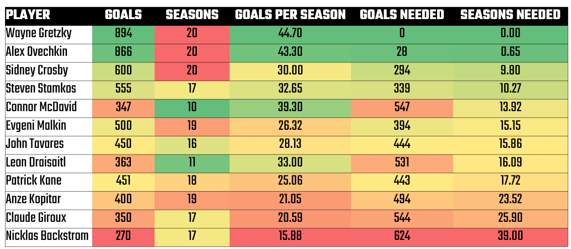 The resulting table summarize Goals, Seasons, Goals per Season, and critically 1) Goals Needed and 2) Seasons Needed (based on their total goals per season) to achieve those goals – all towards breaking Gretzky's record. Now, of course any one of these players could have stand-out seasons and that could make the difference, but for some it just wouldn't matter.