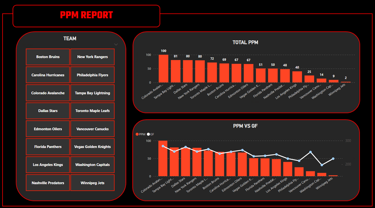 - Multi-Dimensional Analysis: PPM combines statistics from different areas of the game, such as goals scored, goals against, special teams performance, and goaltender efficiency, to capture the team's overall ability. You can add/remove statistics per your liking and need.
