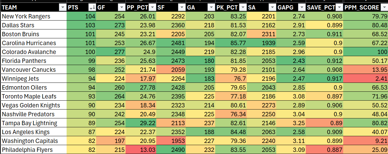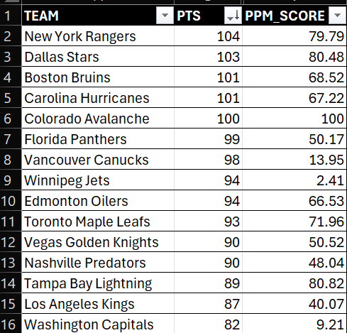 Below, you can see the resulting aggregated score (PPM_SCORE) mapped to the sorted list (by PTS). You can now get a sense for how a team might perform in the playoffs – combining their offense, defense and goaltending.