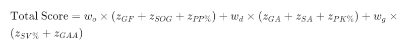 The PPM is calculated by first aggregating normalized scores within each category and then assigning specific weightings to the three categories, reflecting their relative importance in contributing to playoff success. Offense was weighted at 50%, defense at 30% and goaltending at 20%. You could choose to weight the categories differently. The resulting score provides a single metric through which one can measure and rank playoff teams. Here is the specific calculation for the PPM Score: