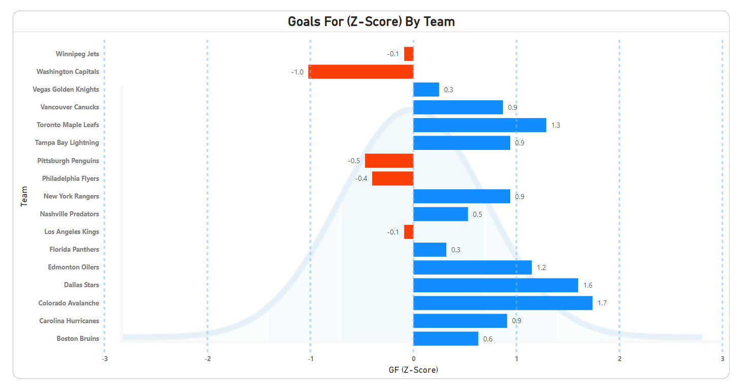 A Z-Score measures how many standard deviations above or below the mean a data point is. Z-Scores are a useful for normalizing different hockey stats because they help to standardize diverse metrics onto a common scale. This is useful when comparing metrics that have different units or scales of measurement. A positive Z-Score says the data point is above average. A negative Z-Score says the data point is below average.