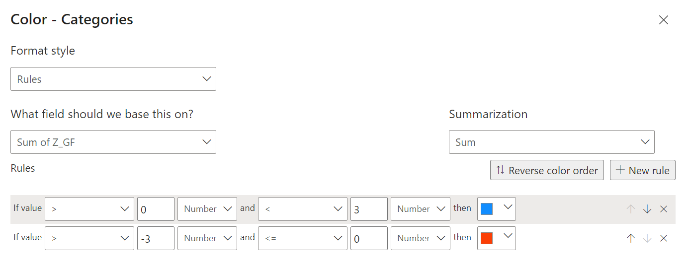 - Add conditional formatting to the bars – different colors for positive vs negative values. Click the function button under Color to configure.