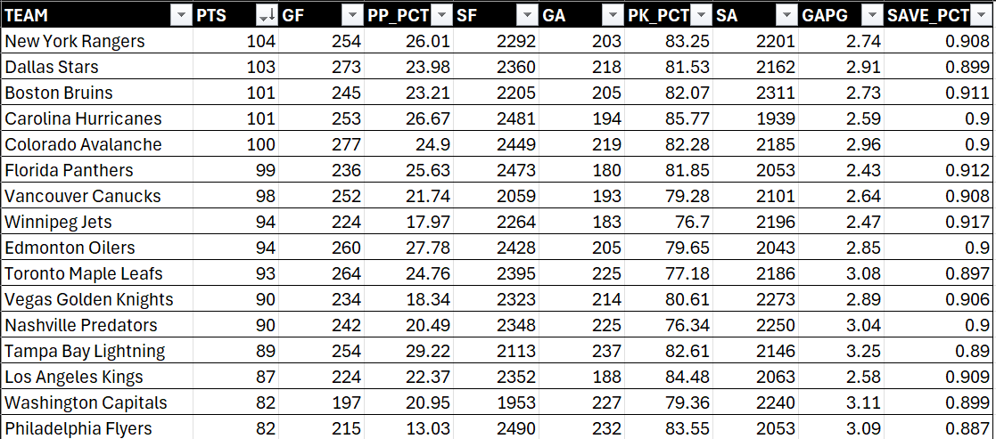 To make sense out the PPM Scores, we can explore the statistics we chose across offense, defense and goaltending. For example, Winnipeg Jets had a net PPM Score of 2.41, leaving them in the lowest spot out of this top 16 cohort. According to their statistics, they had the second-weakest power play, worst penalty kill, and less-then-stellar shots against. These all could be significant factors when it comes to tighter playoff play. Does that mean they are the worst option across these teams? Potentially not, but as you think about creating your own metrics be sure to evaluate how team or player statistics ladder into an aggregate metric so you can frame and use it properly and get some use out of it.