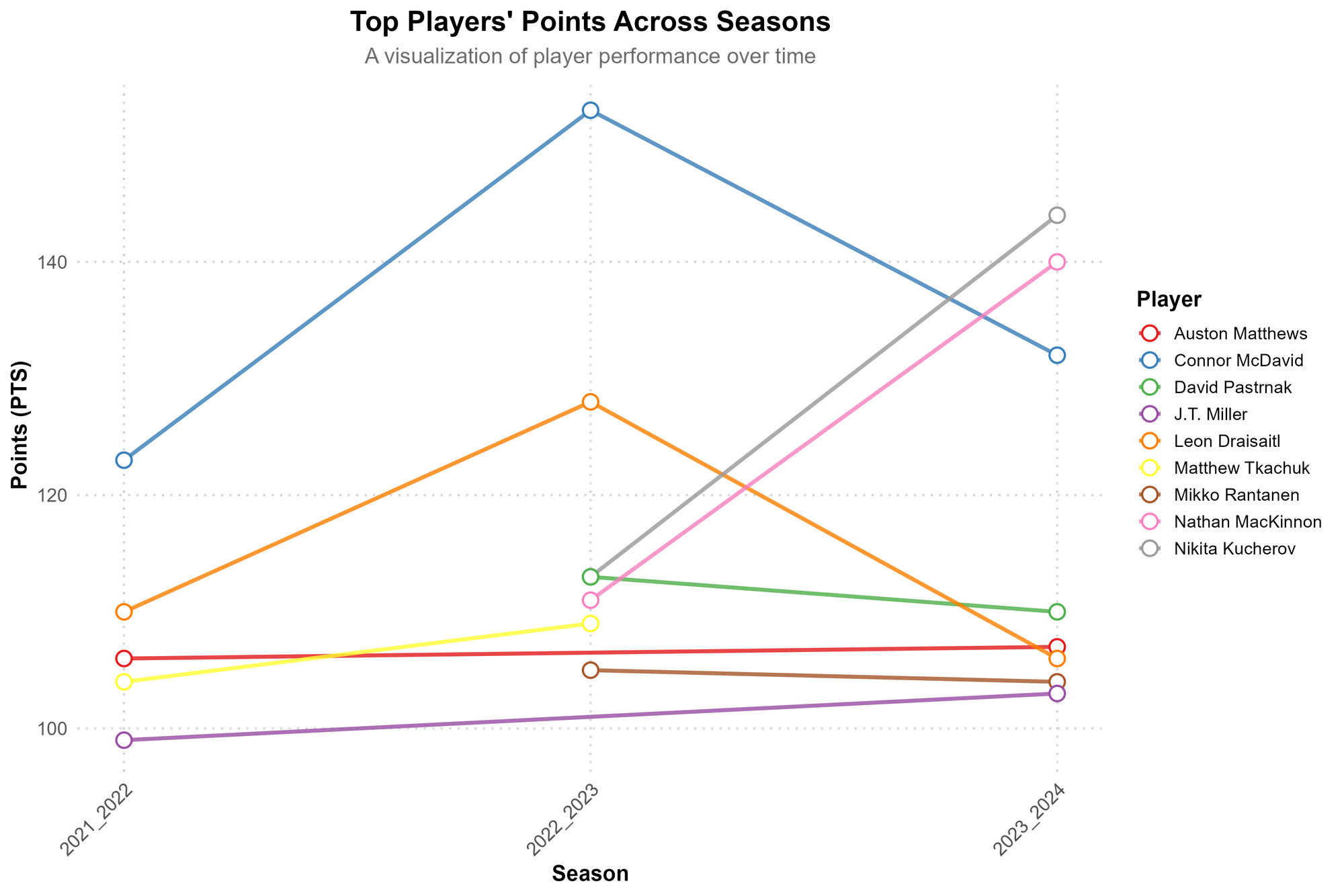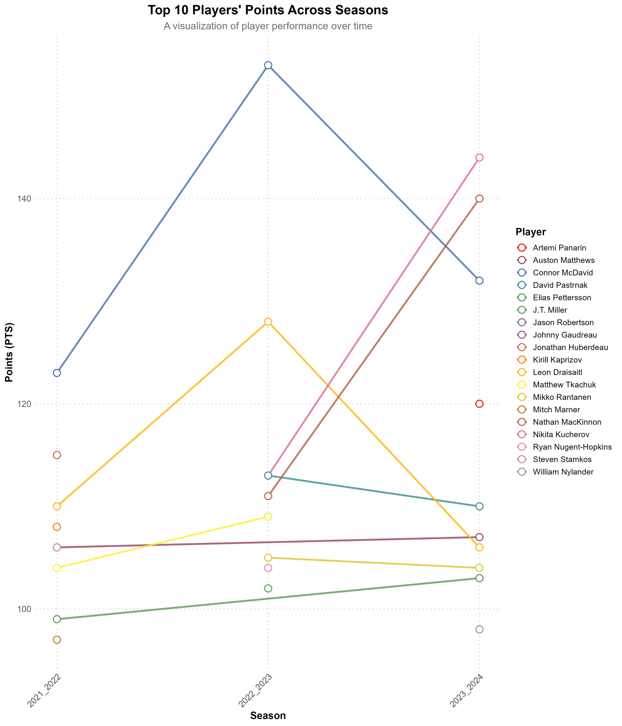 The result of the above R code is the below multi-line chart. You can use the chart to view the degree to which players improve their point production across the three seasons worth of data.