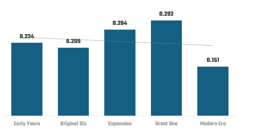 The Modern Era has seen significant rule changes that have de-emphasized fighting and enforcer roles. The introduction of the salary cap, stricter rules against fighting (such as the instigator rule), and greater awareness of player safety have shifted the game towards skill, speed, and finesse. Modern players tend to specialize more in either offense or defense, and fighting has seen a significant decline. This explains the lower EPI scores, as players focus on contributing in different ways.