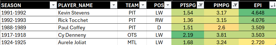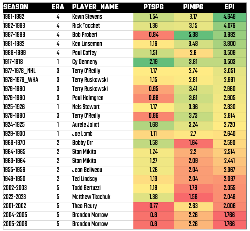 We then evaluated the EPI trend across eras and seasons and then found the top players across each era. We eventually distilled the list into the top five point-producing enforcers in that 108 year history.