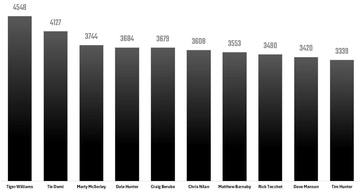 In this week's newsletter, we explored the top enforcers in the history of the NHL. We found the top ten teams, top ten enforcers and then distilled this down to the all-time, top enforcer in the 108 years of the NHL: Tie Domi. To do that, we filtered for the top players with the highest Penalties in Minutes (PIM) in the player dataset.
