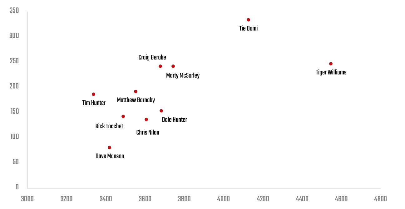 If we add the dimension of fights into the mix (Total Fights on the Y axis and Total PIM on the X axis), two players stand out from the rest: Tie Domi and Tiger Williams.
