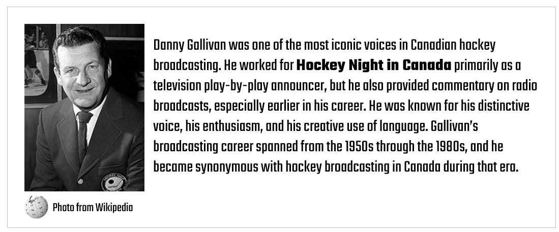 In the late 70s, we had an old Zenith television, on which my father and I would religiously watch Hockey Night in Canada. He didn't always like the television commentators, though, so sometimes he'd mute the television and listen to Danny Gallivan who would do the play-by-play on CBC Radio.