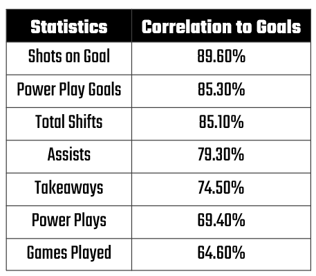 For example, we selected the following statistics from our dataset, which showed positive correlations to Goals. Most of them also made sense. For example, you need to shoot to score, so higher shots on goal should result in goals (especially when we're talking about elite players) and more time spent on ice correlates to higher goals (you can't score when you're sitting on the bench).