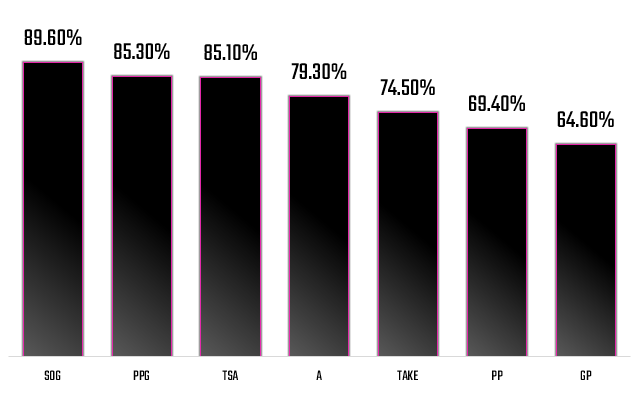 - Four variables are very strong (TSA, SOG, PPG and TAKE) and two are moderately strong (PP and A).