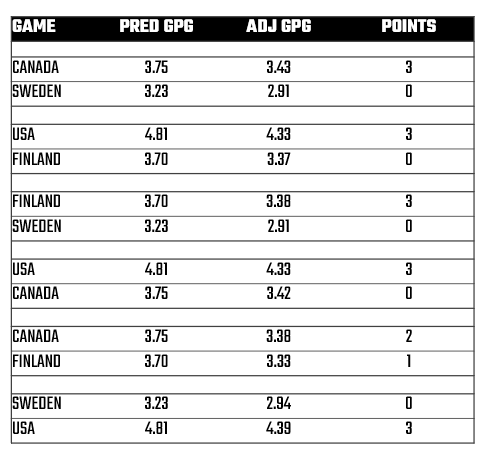 For the first adjustment, if we take each country and add the total possible GPG for each country, you get high numbers compared to the average goals scored in a hockey game (3.12 goals per game): 6.41 for the USA, 5.00 for Canada, 4.93 for Finland and 4.30 for Sweden. To account for the highly-skilled players, we adjusted the GPG down by 25%. This didn't change the ranking, but it does give us goal scoring closer to the average. Thus, the ADJUSTED GPG becomes the core GPG value to use in our prognostications.