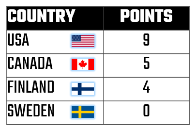 And if we tally the results of the above into the final Round-Robin tournament results, we get the following. So, using our model USA is the clear winner and it's a tight second between Canada and Finland.