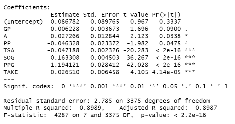 Note that the significance of each of the predictors is strong (save for GP) and the overall R-squared value for the model is 89.9% โ this is a good result.
