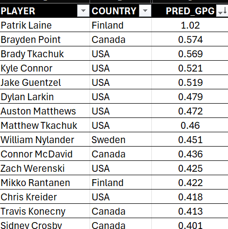 This was our final newsletter on the tournament, and we built a simple linear regression model to predict the final outcome of the tournament. Our model predicted the Goals at the player level, which we then adjusted by factoring in the skills of the player and the goaltending Save Percentage. We then used the resulting predicted GPG to forecast the outcome of each game and the assigned a point scoring to each game.