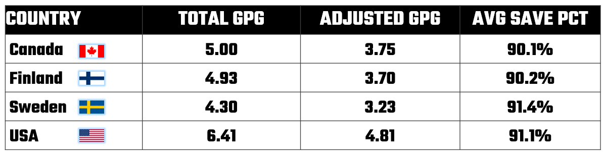 The second adjustment is the AVG SAVE PCT, which is used to further constrain potential goals against specific opponents. For example, when Canada plays Sweden, their ADJUSTED GPG is 3.75 * 90.2%, or 3.43. And you do this for each of the games to get an adjusted GPG that factors in opposing goaltending.