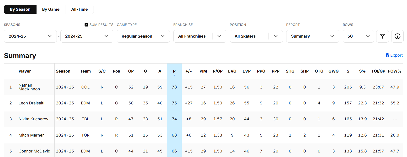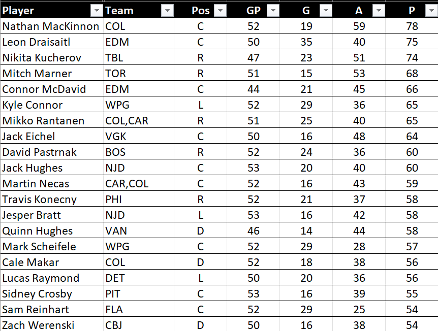 - Open the downloaded Excel file, which will have the top 50 skaters by Points (P).