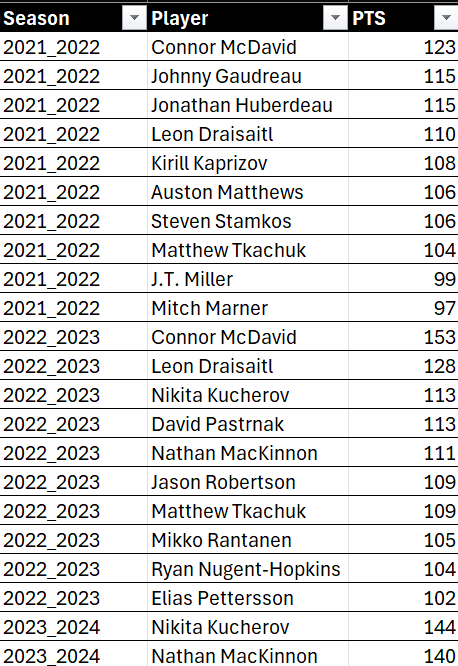You now have an Excel file with three seasons worth of top ten point-producing players, with which you can create a trend report.