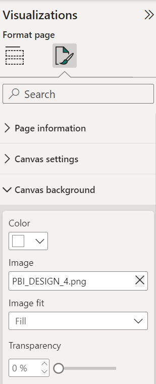 - In the Visualizations pane, expand Canvas background and in the Image field browse to and load your background design.