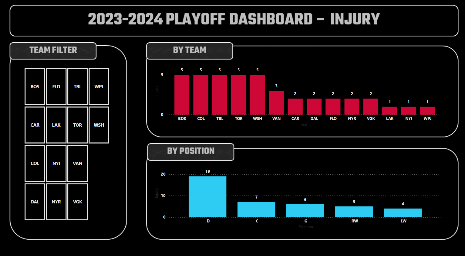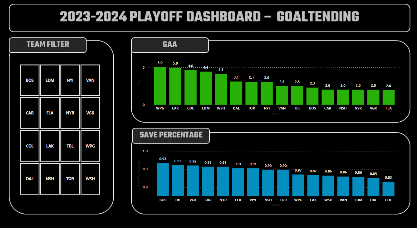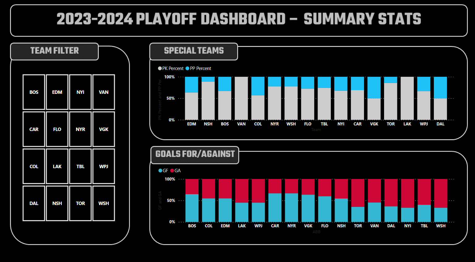 The datasets above will be refreshed daily during the 2023-2024 playoffs. So, if you use these data sources and build out the report using the tutorial below, then you will have your own playoff dashboard!