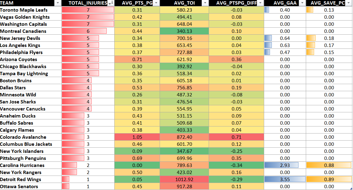 For this dataset, we saved it and then used Microsoft Excel to create a heatmap. This gives you a team-level view where you can begin to see how the total injuries incurred for that snapshot could impact production. For example, Toronto have 7 injuries with an AVG_PTS_PG of 0.31 (below the league average for impact) whereas Colorado have 3 injuries with an AVG_PTS_PG of 1.05 (three times the league average for impact).
