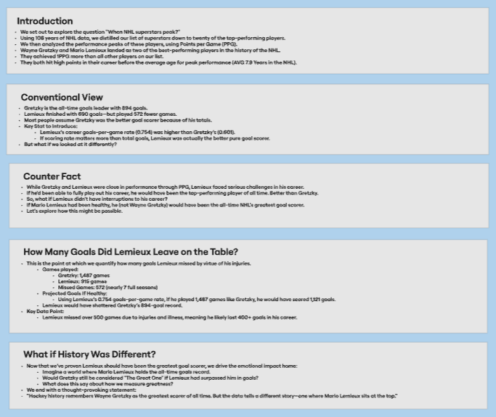 Break down the data visually and narratively. You've seen this before in the Socials and Infographics, but for this one we'll leverage the line chart and statistical comparison of Gretzky's and Lemieux's career. We're going to also show actuals and projected; this brings our hook out a bit.