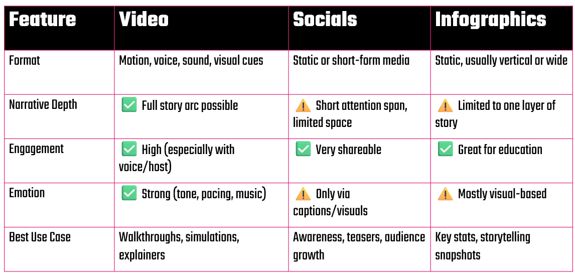 What's also great about video is that it leads to high engagement and retention. According to Forbes, viewers retain 95% of a message when they watch it in a video vs only 10% when reading it. Further, it's good for explaining difficult concepts like models, simulations, or time-based comparisons. And lastly, it's reusable across platforms; that is, you can edit one long video into shorts, reels, carousels, or animated GIFs for socials and presentations.