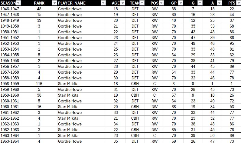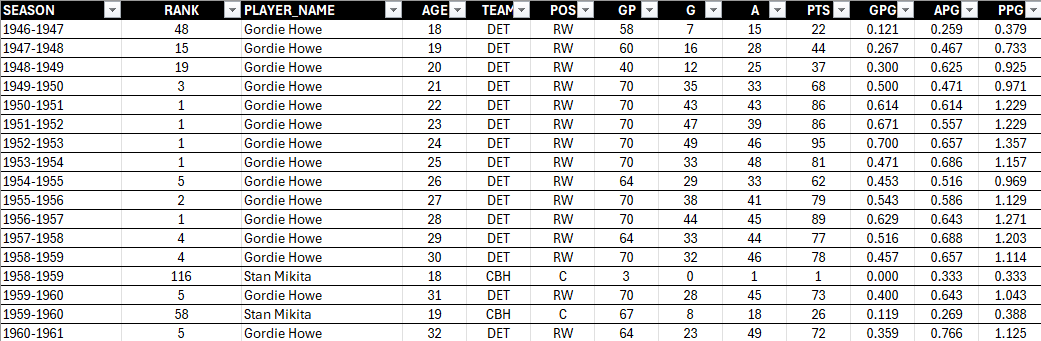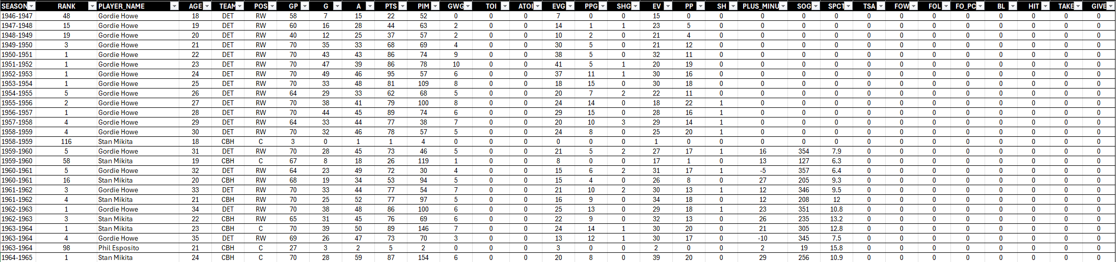 You should immediately notice that there is a lot of zero values in the data. At first glance, this may seem odd. But, if you look at the SEASON column, you'll realize this is the history of hockey statistics playing out in the dataset. That is, as the game of hockey evolved, so too did the collection of statistics. You'll find this parallels other sports as well.